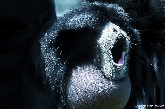 - During vocalization, the hairless pouch on the throat of a Siamang gibbon expands. It is responsible to add volumes to its calls, which can be heard over for 4.8 kilometers through the jungle.